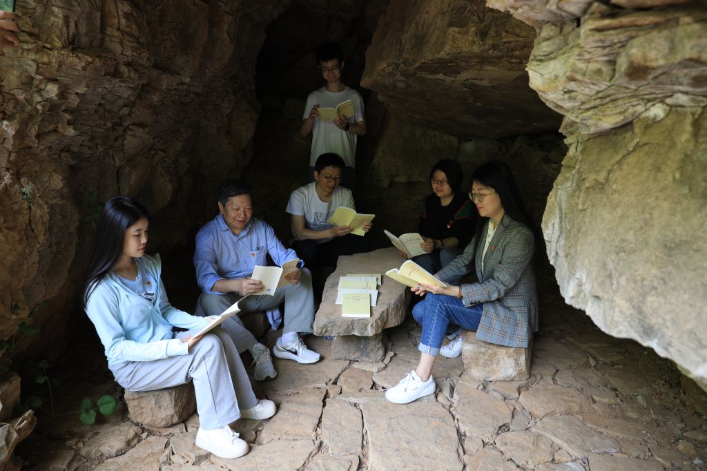 本次活动还在教育基地的红崖洞,平谷第一党支部成立的地方,开展了读书分享和交流,党员同志们依次分享了《习近平关于调查研究论述摘编》和《习近平新时代中国特色社会主义思想学习纲要》中的重要内容。其中王祖林老师分享了“正确认识和把握中长期经济社会发展重大问题“的部分内容,201教研室党支部书记孙兵分享了“依靠顽强斗争打开事业发展新天地,增强新时代新征程历史主动”的相关内容,机关教师党支部书记付路分享了“实行最严格的生态环境保护制度,共建地球生命共同体”相关内容。